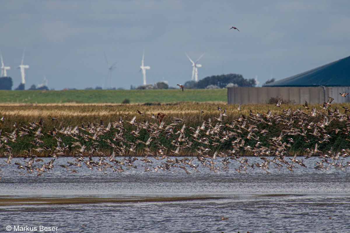 Da ein seit Wochen gemeldeter Großer Schlammläufer immer noch im Fahretofter Westerkoog gesehen wurde, sind wir am nächsten Tag direkt dort hin. Nach langem Suchen konnte ich ihn "entdecken", leider sehr weit weg. Aber er war durchs Spektiv gut zu bestimmen. Eine bis dahin öfters im Hauke-Haien-Koog gemeldete Orientbrachschwalbe konnte ich nicht finden. Dafür konnte ich diverse Limikolen, z.B. einige Zwergstrandläufer, sehr gut beobachten. Die Beobachtungshütte am Hauke-Haien-Koog ist sehr gut für Beobachtungen und Fotos geeignet.